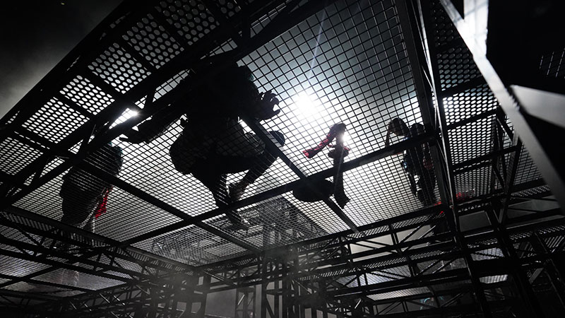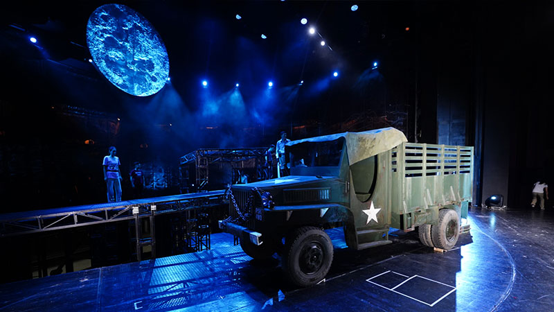 整个戏剧场舞台的每一个表演区,演员所能涉及的每一组动作空间全部由金属铸造,使观众感受到金属与金属的撞击,能够身临其境于战争的惨烈。大刀向鬼子们头上砍去;子弹在空气中穿梭;齿轮在铁轨上转动……金戈铁马、枪林弹雨、火花四溅!