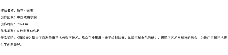 本次展览以“艺象新生”为主题,借助现代科技的力量,对音乐、舞蹈、戏曲、话剧等表演艺术进行重新诠释。展览通过数字技术这座桥梁,打破时空的界限,让古今艺术在瞬间交融,观众将在有限的空间内,体验到跨越四海的艺术精华。本次展览精心策划,汇聚了众多科技与艺术交融的创新杰作。从沉浸式的互动影像装置到智能AI驱动的虚拟人物,从立体全息投影到震撼的裸眼3D视觉艺术,每一项展示都是对传统艺术形式的现代演绎,让经典之美在数字时代焕发出新的生命力。通过数字技术的加持,我们将表演艺术以全新的形式呈现于世,不仅重现了经典之美,更赋予了它们新的时代内涵。这是《艺象新生》展览的缘起,也是我们对传统文化深深的敬意和对未来无限憧憬的体现。