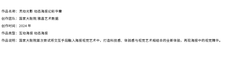 在数字技术的赋能之下,国家大剧院的原创剧目不再被束缚于传统的形式,VR剧场、动态人像、数字交互,多种多样的呈现方式为其注入灵动活力,开启了通往未来艺术世界的崭新大门。观众将沉浸式体验国家大剧院原创剧目,通过探索剧情并感受舞台,享受科技赋能下艺术所绽放的独特魅力。
