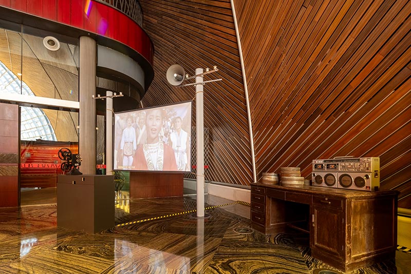 音乐唱片、创作手稿、复古海报、珍贵剧本等资料悉数亮相,在这里您可以通过扫码试听老唱片的激昂旋律,解锁更多老电影旋律背后的故事,还可以欣赏到老电视机播放的怀旧电影;您可以在怀旧电影院的售票处参与集章活动,在挂满老电影海报的复古场景之中沉浸式打卡,还可以在露天电影放映区参与互动体验。