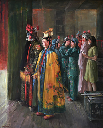 油画与戏曲的结缘开辟了戏曲题材创作新的境界,以油画的形式表现戏曲的台上幕后,展开了丰富的视觉世界。许多油画家热爱戏曲,有的长期着迷,足有心得。他们对戏曲的热爱,体现了增加自身艺术修养、审美品味的自觉追求,也在绘画艺术与戏曲艺术相互融合的研究中增进了油画的表现力,在作品中展现出与戏曲艺术的文化共鸣。在这个展览中,可见几代油画家以戏曲为主题的创作风采,他们用自己独特的视角撷取舞台的一角,用自己的心灵体验戏曲的故事,在作品中传达出戏曲丰富的内涵,塑造了有性格、有神采、有风范的戏曲人物,折射出他们深厚的文化学养和对真善美的讴歌。