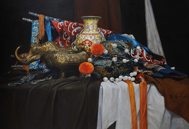 《有戏曲故事的静物》于少非 布面油画 80x90cm 2016年