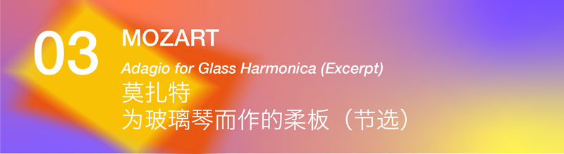 玻璃琴是美国著名的科学家、发明家、社会活动家富兰克林发明的一种乐器。富兰克林将发声的单体由高脚杯改为底端有套接孔的碗状玻璃,由大到小依序串接后横卧于琴架,演奏者以沾湿的手指碰触玻璃碗的边缘来演奏。小提琴大师帕格尼尼更赞叹道:“这是天堂的声音!”莫扎特初闻玻璃琴,立即为之着迷,为这件乐器作有数首作品,这首柔板充分展示了玻璃琴轻盈缥缈的音色,也包含了莫扎特最优秀的旋律创意。