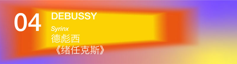 德彪西(Achille-Claude Debussy,1862-1918),法国作曲家,他的音乐被冠以“印象主义”的标签。这段音乐的文学意象是取材自古希腊神话:牧神潘爱上了山林之神绪任克斯,为了躲避牧神潘,绪任克斯化作一丛芦苇,潘神遍寻不着,便折下芦苇做成乐器,吹奏起音乐……乐曲开始,旋律宁谧而略带忧伤,德彪西充分发掘了长笛的特点,通过不同的吹奏技巧展现出长笛的明媚、柔美及锦缎般的音色,并在乐曲中自由运用半音阶、五声音阶和全音阶,带来与众不同的、晦明晦暗的色彩。