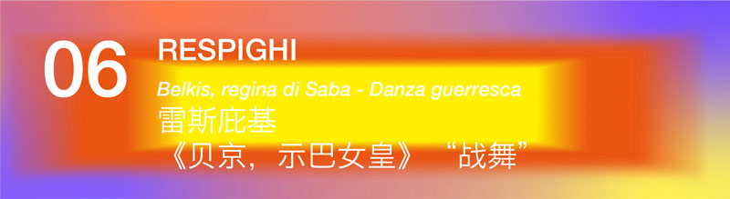 雷斯庇基(Ottorino Respighi , 1879-1936)是世纪之交意大利器乐创作领域最具天赋的作曲家,他的管弦乐创作色彩斑斓、美妙动听,具有非同一般的感染力。这部芭蕾舞剧再现了公元前1000年示巴女王贝京的一系列的奇妙旅程。“战舞”描绘出狂喜的庆祝活动,矫健的年轻战士们在鼓上跳跃、舞蹈,足踵锤击出雷鸣般的节奏,充满异国情调的管乐间或其中,战士们充满阳刚之气,“发出战争呐喊,同时挥舞着长矛,跳着他们奇妙的舞蹈”。