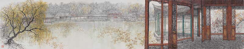 我久久的在长廊里踟蹰,看着那百余幅的园林长卷,我的眼里储满了泪水,我分不清天上人间,画老了,画熟了,行云流水,浑然天成,渐入化境,可以藏之名山,传诸后人。但是日月不老,我们的画家,我们的朋友王明明不老。