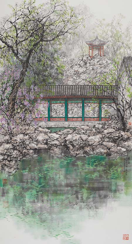 这次大型园林系列画展,用王明明自己的话说是他的衰年之作。他说人老了,心头的波涛平静了,目光更加慈祥更加温和了。有些山在眼里已经不是原来的山了,有些石头也不是原来的样子了,湖水平静了,水里的倒影清晰可见。总之,这个世界在他的眼里变了,他对这个世界的态度也变了,他的心恬淡平和,他的笔随意散淡。他的眼前是遮不住的青山隐隐,流不断的绿水悠悠,是红颜春老,落花满地。这也许就是他与以前的不同,一个全新的艺术境界。