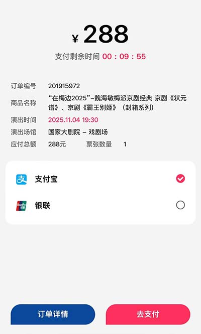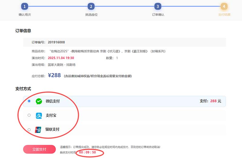 8、支付环节:目前系统支持10分钟的支付时间,锁座期间,请尽快完成支付(可通过三种支付方式)完成。