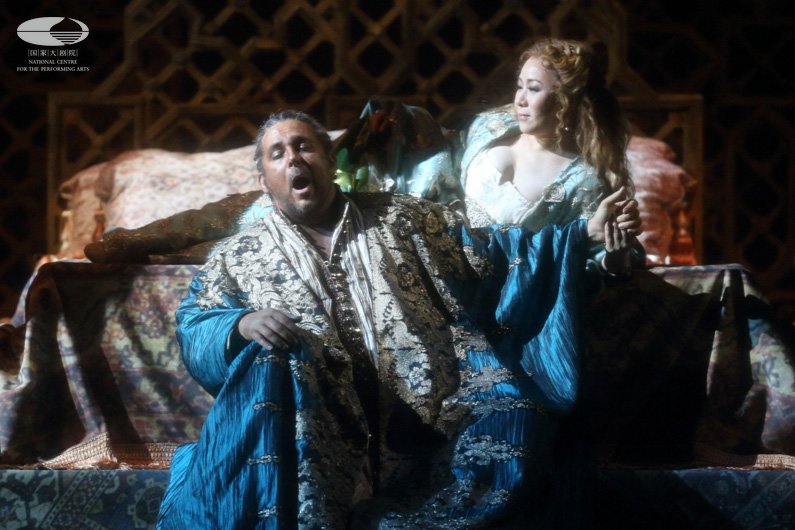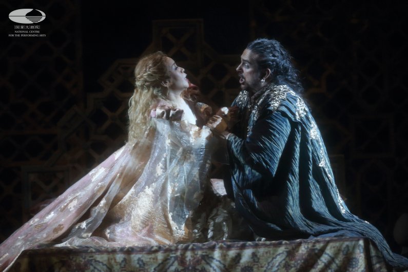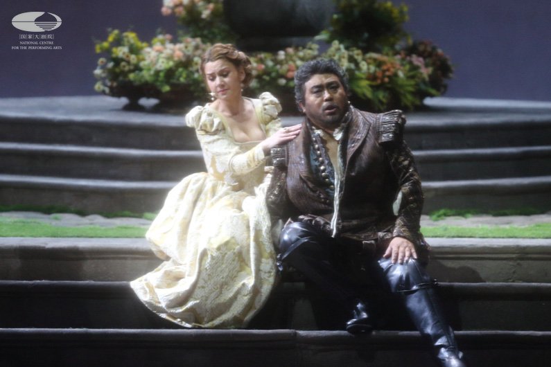 第一幕 奥赛罗(左 弗兰克·博雷塔饰)和他的妻子苔丝黛蒙娜(右 张立萍饰)享受着他们的美好爱情 王小京/摄