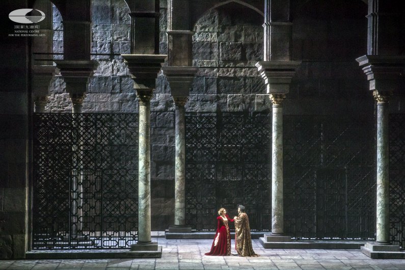 第二幕 当苔丝黛蒙娜(左 拉娜·科斯饰)请求奥赛罗(右 魏松饰)原谅卡西奥时,奥赛罗表现得更加震怒 王小京/摄