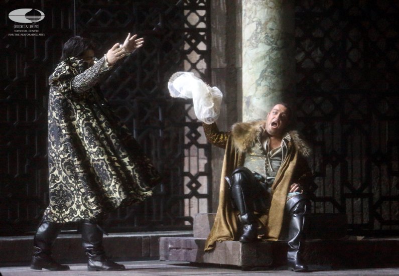 第三幕 亚戈(左 尼古拉·米加洛维奇饰)继续策划他的阴谋诡计,他将苔丝黛蒙娜的手帕偷偷塞给卡西奥(右 朱塞佩·瓦拉诺饰),并安排奥赛罗偷听他们的谈话 王小京/摄