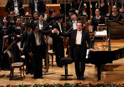奥地利钢琴演奏家鲁道夫·布赫宾德(右前)与乐团完美合作 王小京/摄