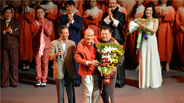 观众的掌声、叫好声证明了昨晚演出的成功。演出结束后,在国家大剧院副院长邓一江、国家大剧院歌剧艺术总监吕嘉的搀扶下,金湘迈着颤颤巍巍的步伐走上了舞台,与演员们一同向观众致谢。