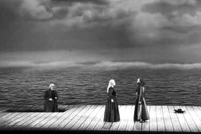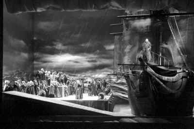 大幕揭开伊始,那深邃、奇幻的景观已深深吸引观众。挪威船长的帆船在翻滚的巨浪中摇摆颠簸,海上的惊涛骇浪咄咄逼人,好像随时要向观众席袭来。正如导演莫纳科所言:“要让观众坐在剧场中品尝到海水灌进口中那咸咸的味道。”整个故事在观众眼前徐徐展开。