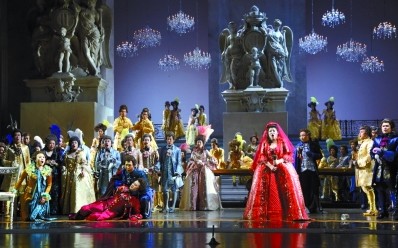第三幕的“假面舞会”是本剧最宏大的场景,也是全剧的高潮。百余名演员佩戴着各色精美的面具翩翩起舞,给人强烈的视觉冲击。国家大剧院相关负责人介绍:“舞会服装全部都是按照当时的版型裁剪和设计,乌戈对服装质量的要求非常之高,很想回归当时的历史年代,款式结构都是相当复古的设计,但是导演根据舞台需求,进行了精细的色彩搭配和面料选择,在装饰的点缀上也融入了他的设计理念,每一件戏服都可以说是一件艺术品。”