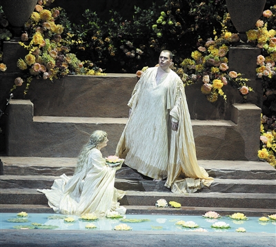 《罗恩格林》再度挑战了人们对于国家大剧院舞台空间的想象。第二幕换景时,高大的教堂立柱缓缓下沉直至从人们的视线中消失,一个数十级的教堂台阶从舞台下方缓缓升起并延伸到舞台深处,盛大的婚礼现场就是在这个台阶上进行的。第三幕亭台楼阁、鲜花遍地的花园魔术般地消失,而一座“大山”从舞台深处慢慢推进,最终出现在人们面前。强卡洛对于大剧院歌剧院的舞台可谓驾轻就熟,几个场景都是在短时间内完成的,“乾坤大挪移”的舞台调度技巧多次令人发出赞叹。人们也同时在猜想大剧院的舞台空间到底有多大。