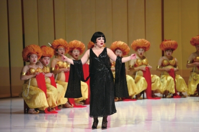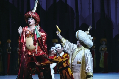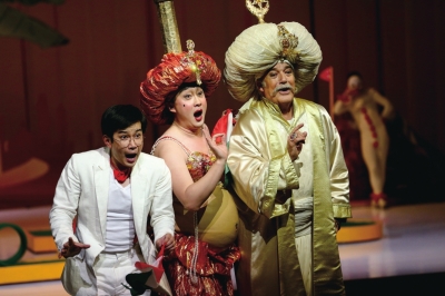 11月28日晚,罗西尼喜歌剧《意大利女郎在阿尔及尔》在国家大剧院戏剧场首演,这也是大剧院继《费加罗的婚礼》后,再次把大制作安排在戏剧场演出。序曲奏响后,台上的哑剧演员们身着意大利丑角服装,推出一架飞机,并模仿飞机坠毁,趣味十足。阿尔及尔总督穆斯塔法开豪车炫富,还不时掏出“土豪金手枪”威胁不服从他的人。总督仆人林多罗上身是西装领结,下身却是短裤白球鞋红袜子。合唱团的表现更是令人忍俊不禁,第一幕中大肚子戴南瓜帽的“后宫太监”,一面织毛衣一面合唱;第二幕中则化身“意大利奴隶”,穿上了紧身连体衣表演,十多个男人高矮不一,“燕瘦环肥”,充分展露各自的身材,令现场笑声几乎没停过。导演添加的中文包袱也成了点睛之笔,比如穆斯塔法上场时被小丑演员绊了一跤,便用东北口音喊了一句,“哎妈呀,谁呀!”林多罗在舞台上轰角色下台时也如法炮制,“走了,走了!”