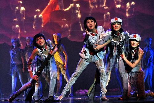《天边的红云》的舞美设计亦富于新意,诸如对舞台空间的处理,层层铺叠、处处着眼、错落有致。在色彩的运用上更是契合了该剧诗化的主题——从军帽上的红五星、军号上的红飘穗、腰带上的红辣椒、背包上的红十字、胸前的红围巾,直至天边泛起的红云,红色始终都成为舞台上永远不变的主基调。该剧的音乐创作,于凄美中见壮丽,于悲壮中显精神,大处着眼、小处争辉。舞蹈与音乐之间产生了美妙的节奏,舞蹈与音乐催生了舞剧的抒情性,使之结合得天衣无缝。
