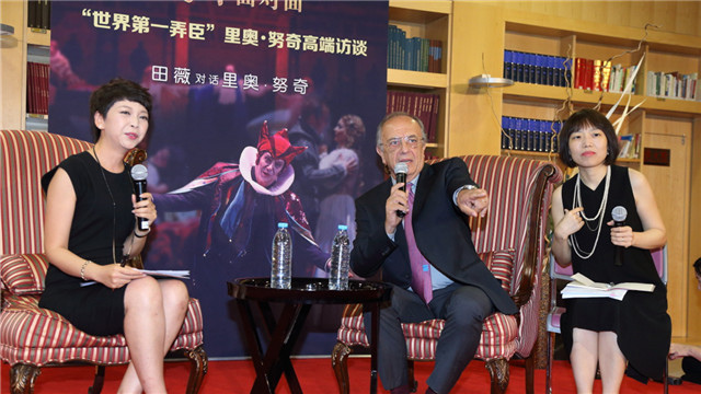里奥·努奇(中)与中央电视台主持人田薇(左)畅谈其40余年饰演“弄臣”的传奇历程与音乐感悟 王小京/摄