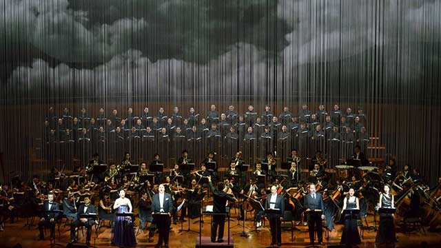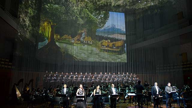 与通常音乐会不同的是,音乐会版《威廉·退尔》借助精美的多媒体设计,不仅准确营造出故事发生的时代与文化背景,而且在画面与音乐的相得益彰中,让观众仿佛来到英雄生活的那个风光旖旎的村落,置身于故事的怀抱中。在序曲中,美丽的琉森湖、高耸挺拔的阿尔卑斯、丛林中魔幻的弩,在看似平静的场景中蕴藏着张力十足的戏剧性。而剧中最为著名的威廉·退尔射中儿子头顶苹果的段落,又用极为简约,但视觉冲击极强的效果进行呈现,同时伴以胜利的合唱,给人十足震撼。此外,战争的铁骑洪流,村落的生活场景都以写意的方式进行呈现,营造出了引人入胜的视觉奇观。