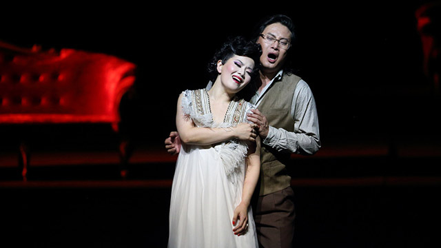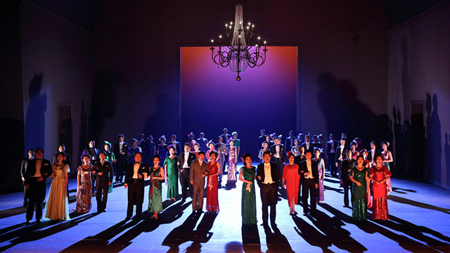 擅于挖掘人性特征的导演李六乙,从曹禺的剧作《日出》中读透世事之酸甜苦辣,洞察人间百态。在歌剧中,他以先锋性的表现手法给观众带来了一场独具一格的戏剧体验。全剧设定在“夜”的背景下进行,极简主义的舞台呈现,利用光线和色彩的明暗交替投射出人性的光与影;整体倾斜的舞台装置,暗合了都市群丑奋力挣扎、向上攀爬的人生。而剧中,更为陈白露的死设计了冲击心灵的画面——当她在舞台尽头炫目的光明中倒下,红色花瓣随之倾洒时,舞台中间也崩裂开一道透着耀眼光芒的缝隙,它缓缓延拓直至红色的光芒映透全场。这片光芒刺痛了那个渴望日出的时代,此时合唱队员们从火红的舞台下走出,以饱含激情与热血的嗓音,燃情唱响了宏大壮阔的旋律“太阳升起来了,明天就要来临”,引无数观众动容。这段合唱是全剧情感的制高点,是曹禺笔下《日出》的精神寄托,也是金湘为一个时代书写的夯歌。
