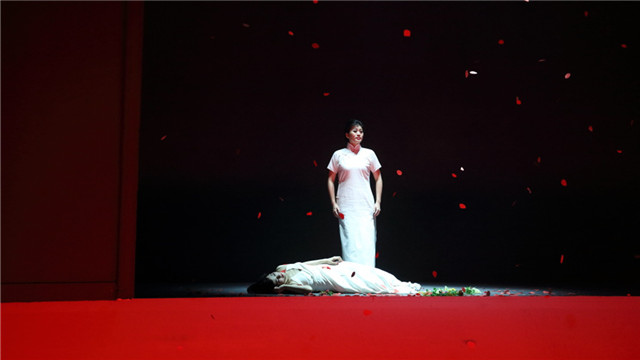 陈白露在舞台尽头炫目的光明中倒下,红色花瓣随之倾洒 王小京/摄