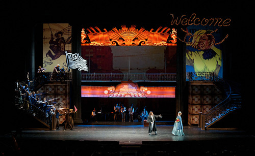第三幕无疑是全剧的高潮,展现了1872年约翰·施特劳斯亲自登台的那场万人音乐会的空前盛况,很多节目也都是当年节目的重现。国家大剧院管弦乐团和人民大学青年管弦乐团两支乐团组成了共150多人的乐队现场起奏,在指挥张艺的出色调控下,两团的演奏宏大、层次丰富,表现令人称道。国家大剧院合唱团的表现同样可圈可点,歌剧《阿依达》中的“凯旋大合唱”、歌剧《游吟诗人》中的“铁砧大合唱”等一系列歌剧经典曲目被精彩演绎,博得了满堂喝彩。舞蹈同样是第三幕中的一个亮点,首次为《蓝色多瑙河》编排的双人芭蕾,由中央芭蕾舞团曾获莫斯科芭蕾比赛金奖的管文婷和同伴王玮呈现,两人用肢体艺术把多瑙河优美的意境表现得淋漓尽致;而为《威廉退尔》序曲编配少年“迎宾舞”则由北京二中舞蹈团演绎,活力四射,英姿飒爽,气势不凡。此外特别值得一提的是,在第三幕中,整个舞台布景是一整面巨大、斑斓的彩绘玻璃,细细看来,其间的图案也是颇具美国味道的酒馆爵士乐演奏的场景。担纲该剧舞美设计的张武表示,他的创作灵感来自于欧洲教堂的彩绘玻璃,但图案却不是宗教人物,而是换成了美国元素的爵士乐队,希望通过这种方式暗合该剧的故事——那就是美国与欧洲的碰撞与交融。