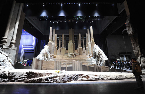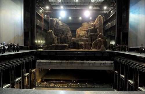 据大剧院相关方面负责人介绍,这次《罗恩格林》在舞台搭建的难度上可说是剧院有史以来最难的一次。这一点,在《罗恩格林》开场中便有体现。在原作中,第一幕的场景是一望无际、荒无人烟的波拉班德平原。但本剧导演强卡洛和舞美设计威廉姆·奥兰迪却不想再现一个乏味的开场,强卡洛说:“在开场阶段,我们想回避原作的发生地,创造一个神话般的场景。今年我和威廉姆在以色列的沙漠中度过了一个月,为《罗恩格林》的创作做准备,那里的沙漠和荒山让我一生都忘不掉。所以,我将用沙漠和岩石作为故事开始的场景。因此,我在第一幕一开场就呈现了两座巨大的岩石,带给观众强烈的视觉震撼,同时整个合唱团也将在这两座巨岩上完成表演。”
