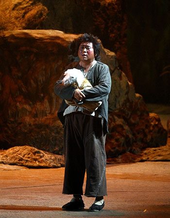 咏叹调“人群里我就是只羊”在剧中多次出现,代表了赶羊的人物形象,这一段忧伤的小调旋律唱出了赶羊的自卑,而由暗至明的调式则表达着他对兰花花的深情爱恋。薛皓垠一改往日的俊朗形象,被化妆师刻意“丑化”成为衣衫褴褛、外形丑陋的赶羊,而丑陋的外表下,一颗单纯质朴的心更加令人动容。导演陈薪伊认为:“只有把赶羊这个角色化丑,戏剧才会美”。