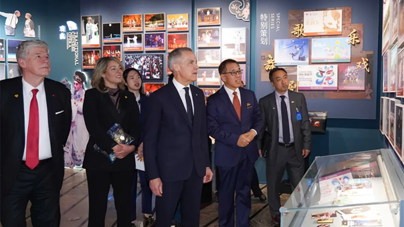 卡尼总理一行参观大剧院室内建筑,观看“永不落幕的舞台——国家大剧院艺术成果展”。国家大剧院院长王宁陪同并介绍了大剧院“一院三址”建设运营及世界剧院联盟发展情况,详细分享了大剧院与加拿大艺术团体及艺术家的密切合作。
